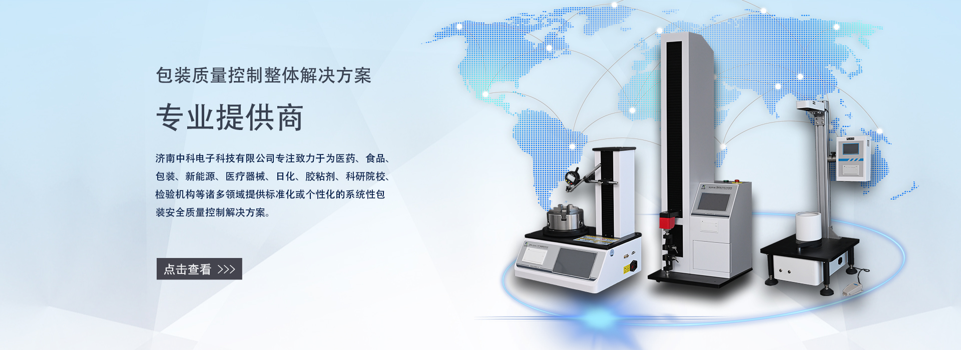 濟(jì)南中科電子科技有限公司是一家集包裝及膜材檢測儀器的研發(fā)、制造、銷售和服務(wù)為一體的專業(yè)科技公司。專注致力于為食品、醫(yī)藥、包裝、新能源、醫(yī)療器械、石化、日化、膠粘劑、科研院校、檢驗(yàn)機(jī)構(gòu)等諸多領(lǐng)域提供標(biāo)準(zhǔn)化或個(gè)性化的系統(tǒng)性包裝及膜材質(zhì)量控制解決方案。